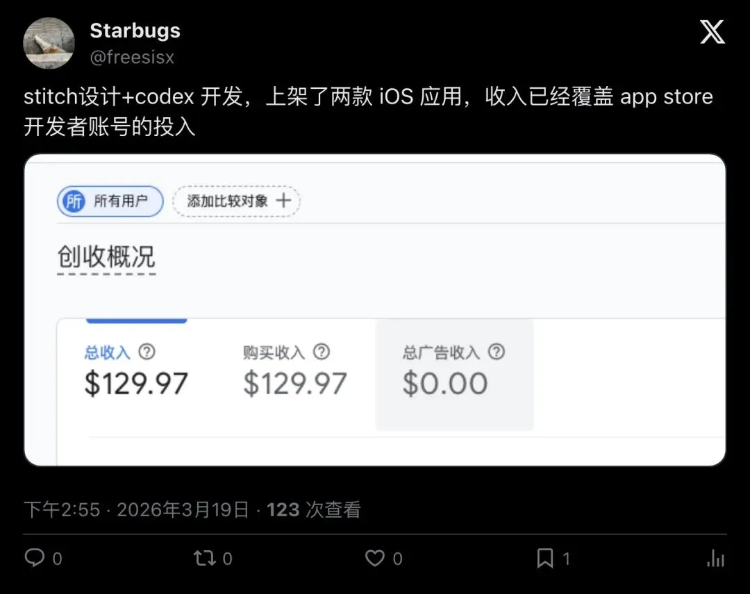 已经有开发者站出来证明:用 Codex 开发并上架了两款 iOS 应用,收入甚至覆盖了 App Store 开发者年费。
