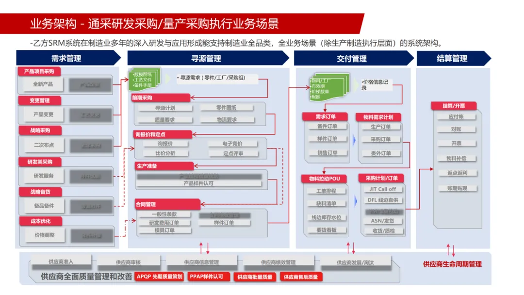 业务需求:覆盖通采与非采全业务场景,实现供应商全生命周期管理与非采业务全流程线上拉通,构建合规、透明、高效的供应平台;推动业务与数据融合,支撑精准决策。