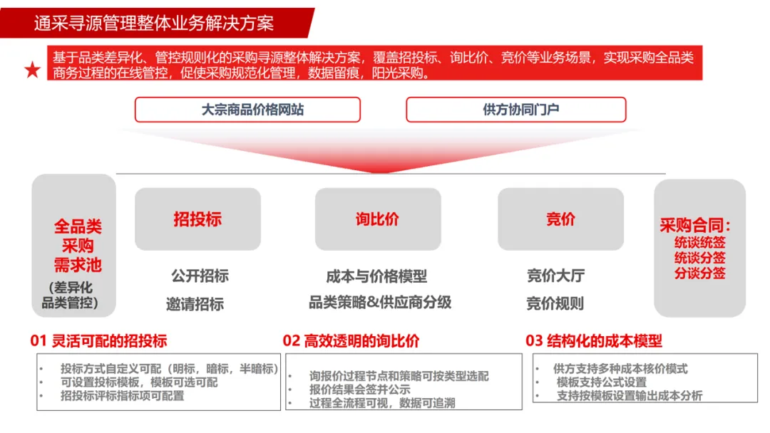通采场景业务闭环:涵盖寻源管理、品类策略、采购协同、财务协同与供应协同五大模块。寻源管理支持招投标、询比价、竞价等多模式,品类策略实现差异化采购与配额管控,采购协同拉通预测、要货、送货、收货全流程,财务协同实现对账、开票、付款线上化,供应协同打通研发、计划、供应端信息壁垒。