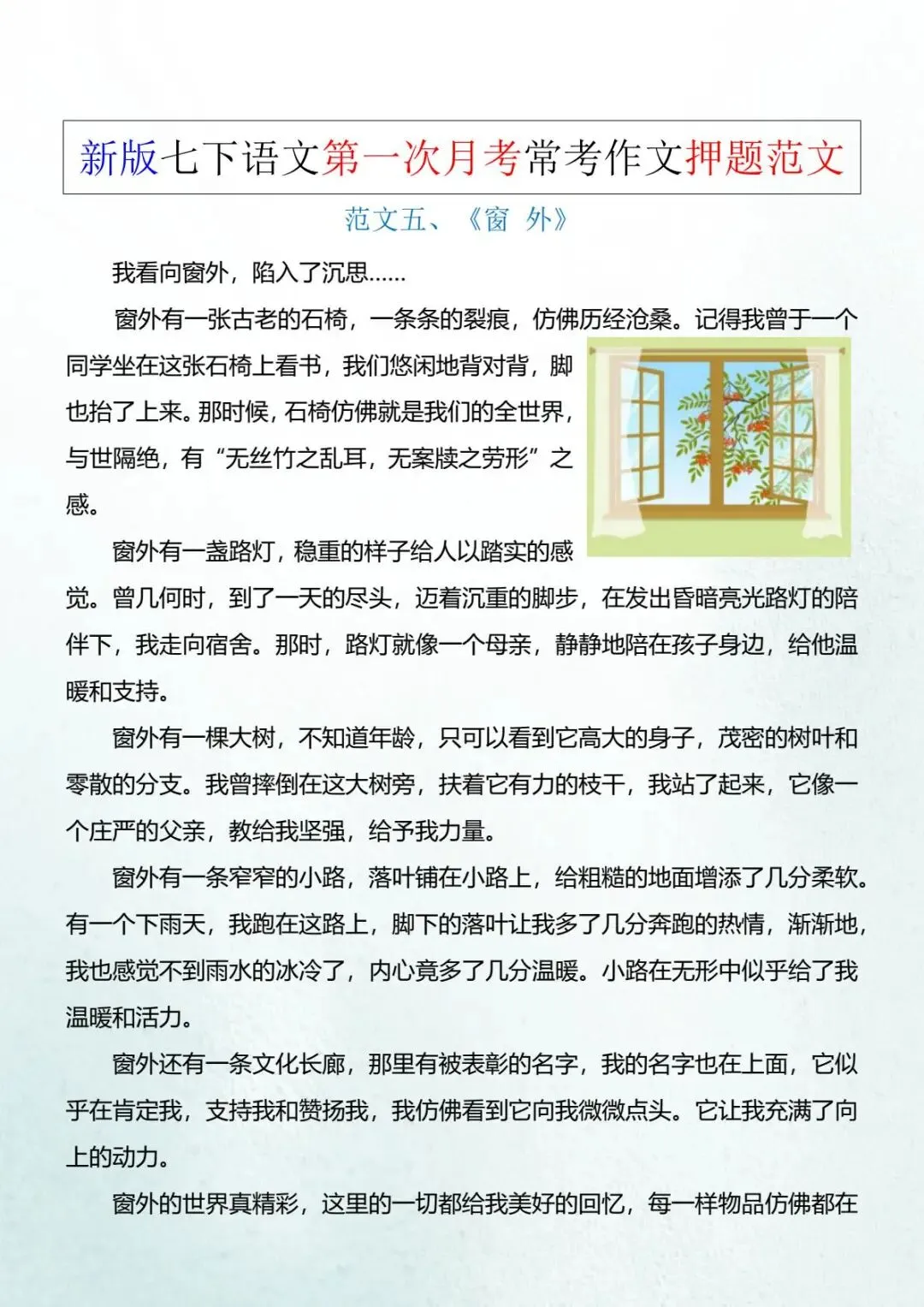 今日分享的是:七年级下册语文《常考作文押题范文》,电子版可下载打印。