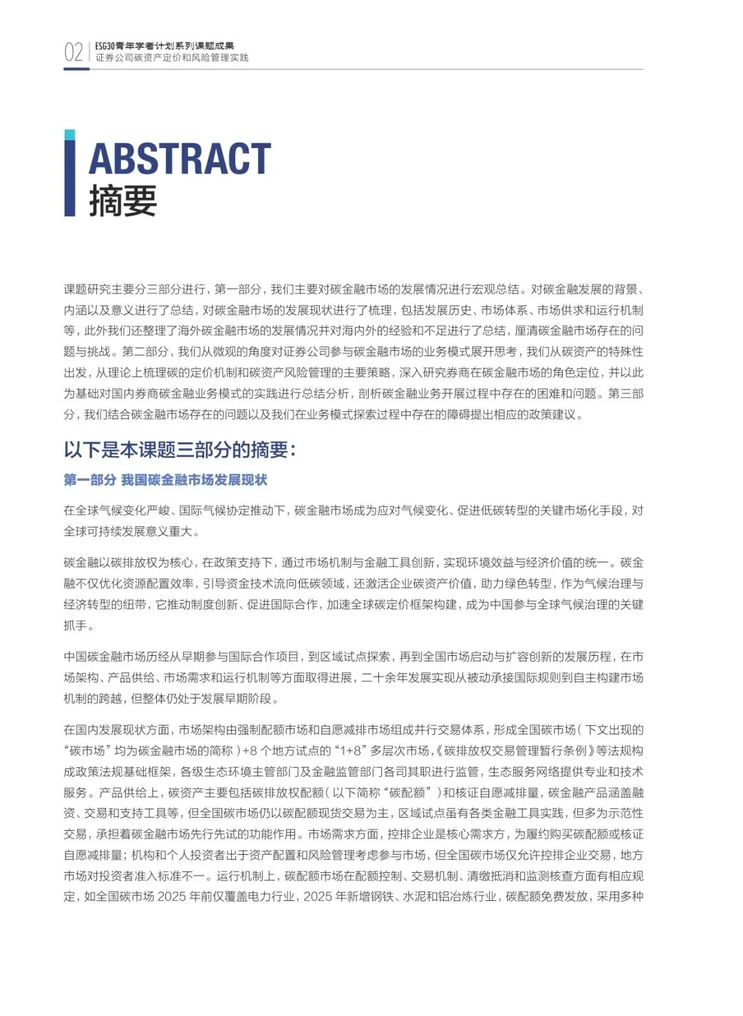 本报告系统梳理了我国碳金融市场发展现状,分析证券公司参与碳金融的业务模式与风险管理体系,并提出政策建议。研究涵盖碳市场宏观背景、券商角色定位、定价机制、风险管理及国内外对比,结合案例探讨实践障碍。