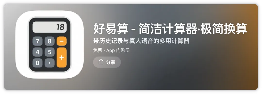 关注公众号艾派得让你的iOS、iPad、Mac设备更实用苹果设备不仅外观颜值耐看基本内置的APP也都超级好用实用但是今天这款非苹果官方的计算器APP更牛逼这款软件叫好易算这是一款功能全面且界面清爽的智能计算工具原本内购高级会员是需要付费的今天限时免费中,0元即可解锁高级会员无论你是需要处理日常开支的小资族还是必须频繁进行复杂单位换算的专业人士这款 App 都能成为你手机中最得力的数字助理通过极致的个性化设定与无广告的干净体验让你无论在工作或学习场景中都能享受精准且高效的计算过程最让我喜欢的就是它的历史纪录功能能自动储存你的每一次运算过程方便随时查阅与回顾它不仅支持多样化的单位换算更具备真人语音播报与震动回馈你还能自由切换多种界面主题并调整显示精度彻底告别广告干扰,享受纯粹的计算环境限免软件,随时可能收费神器推荐App Store 又发现一款永久会员APP劲爆!终于又等到上架AppStore了苹果开发者必备,App Store 评论分析神器软件下载点击下方卡片关注小派的公众号【艾派得】长按下方二维码即可获取看在小派认真的份上、是不是应该点个👍