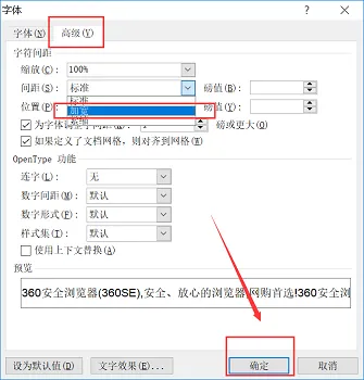 5. 弹出字体对话框,点击“高级”,在高级的界面中,点击间距选项,选择“加宽”。然后点击“确定”。