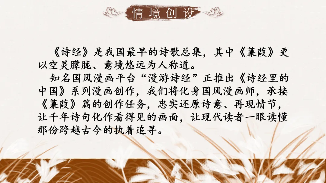 《蒹葭》是中国古典诗歌朦胧美的源头,以“可望难即”的企慕情境成为千古绝唱。