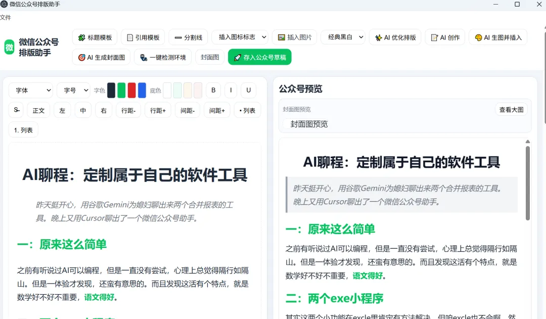 昨天挺开心,用谷歌Gemini为媳妇聊出来两个合并报表的工具。晚上又用Cursor聊出了一个微信公众号助手。