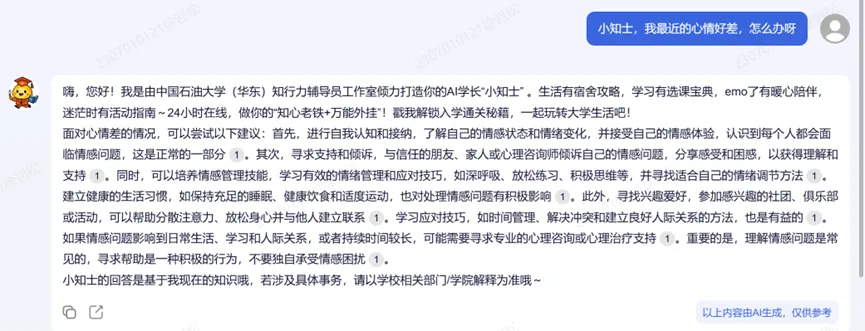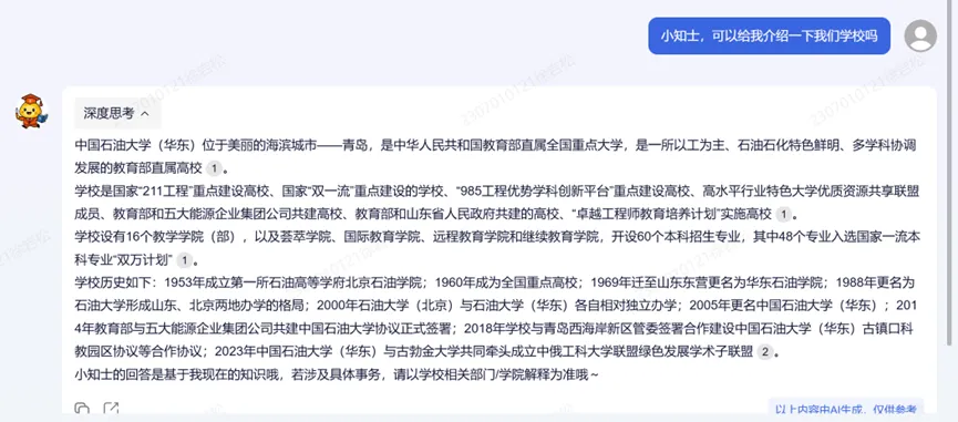 作为中国石油大学(华东)知行力辅导员工作室联合多部门打造的AI智能体,小知士自上线以来,就凭借专业、贴心、高效的服务,被同学们亲切称为“AI大学长”。依托DeepSeekR1大模型技术,结合超20万字专属定制知识库,覆盖学习、生活、心理、思想四大核心领域,核心问题回答准确率超90%,累计服务师生超5000人次,是经过石大学子亲测的靠谱助手,新学期继续为你保驾护航!