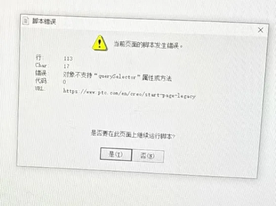电脑软件preo/creo打开软件显示当前页面的脚本发生错误”,虽然一直点下去就好了,但还是影响工作效率。