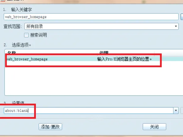 在【设置值】一栏中输入:about:blank,点击添加更改。关闭查找选项窗口