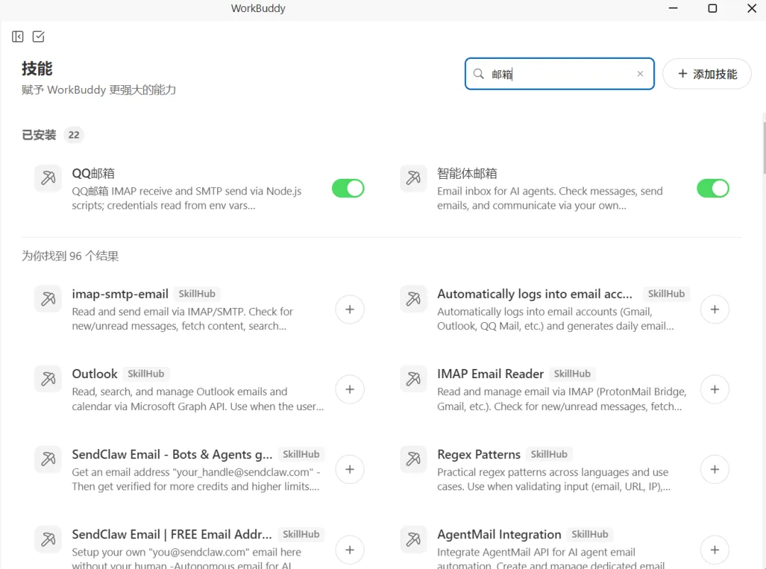 在WorkBuddy官方Skill库搜索”邮件”或”Email”,点击安装即可。支持Outlook、Gmail、QQ邮箱、企业邮箱等主流邮件系统。