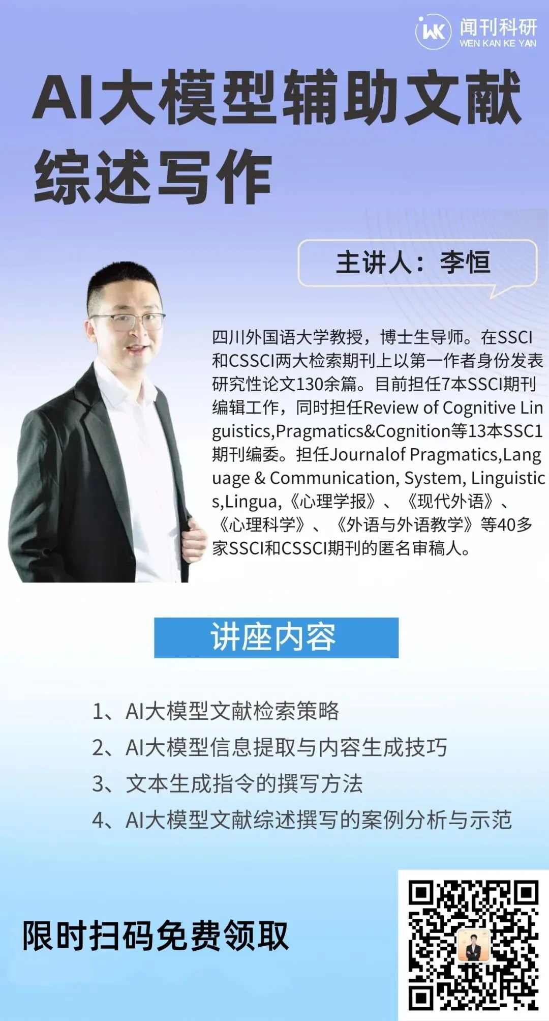 为此,闻刊科研邀请到四川外国语大学教授——李恒老师,为大家带来《AI大模型辅助文献综述写作》,将深入探讨如何运用人工智能大模型来辅助文献综述的撰写,提升研究效率和质量。通过实际案例和示范,帮助大家掌握使用AI工具进行文献检索、信息提取和内容生成的技巧,为自己的研究提供有力支持。