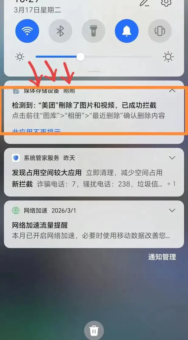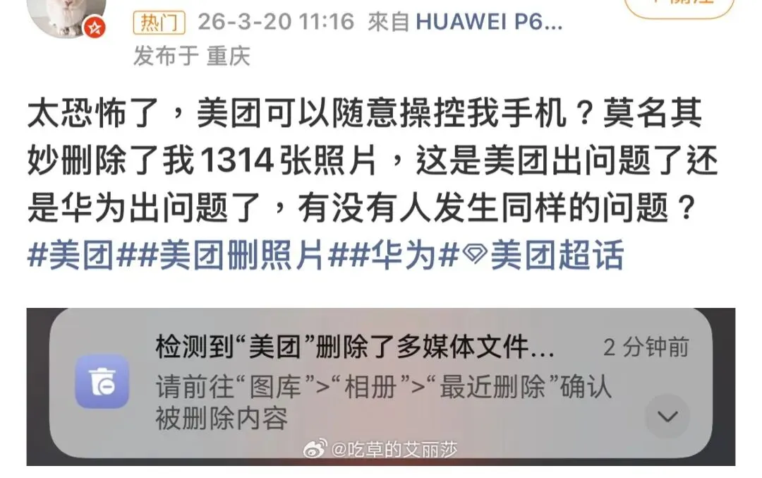 从3月17日开始,华为、小米、荣耀、iQOO等主流安卓机型用户,陆续收到系统警示:“检测到美团删除了你的照片和视频”。