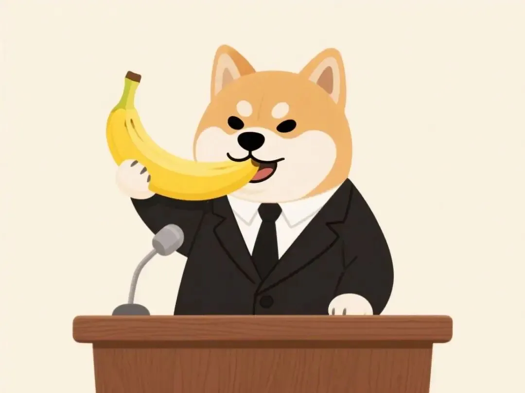 柴犬确实是柴犬,西装也穿了。但那西装是歪的,领带从狗嘴里穿出来,两条后腿站得笔直,前腿却举着一根……香蕉?