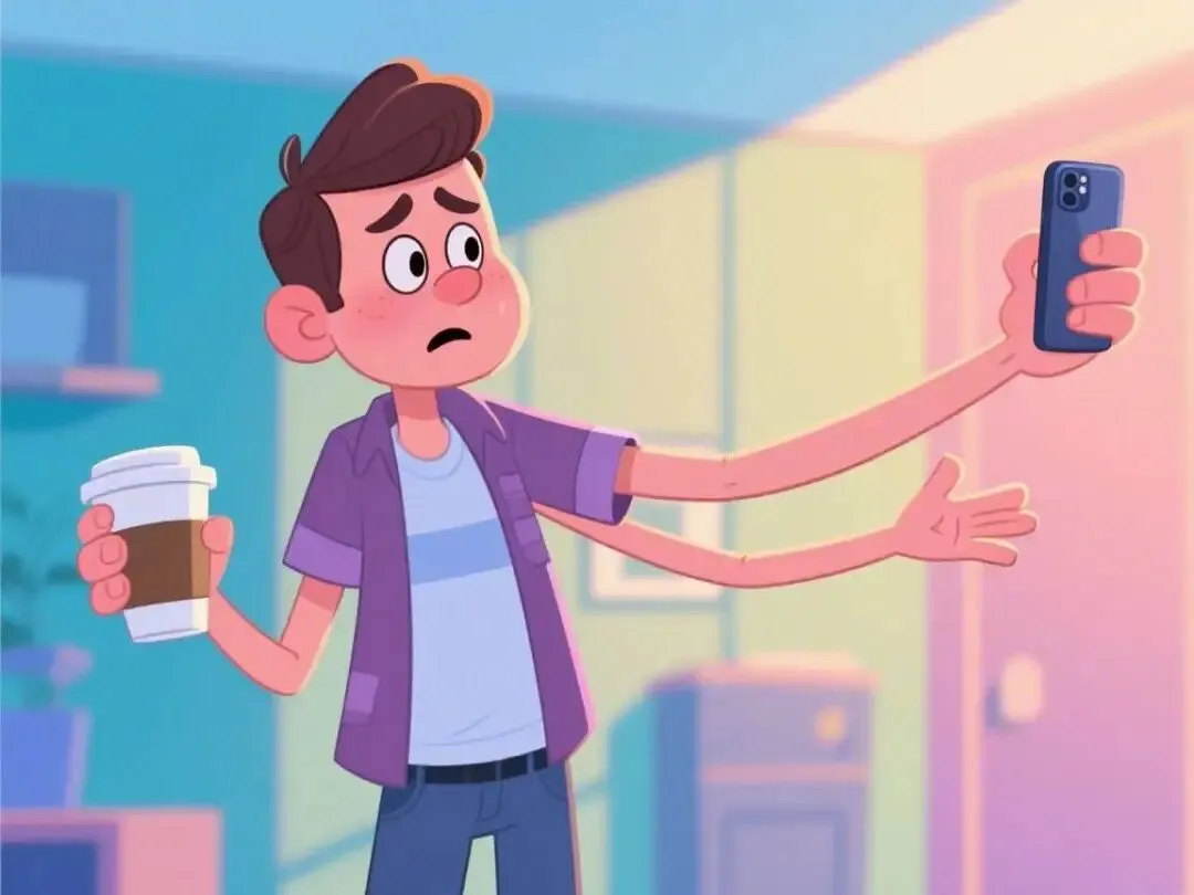 结果出来,人的左手确实拿着咖啡,右手也拿着手机。但那个手机……它没有屏幕,就是一个黑色的长方体,仿佛2003年的诺基亚穿越来了。