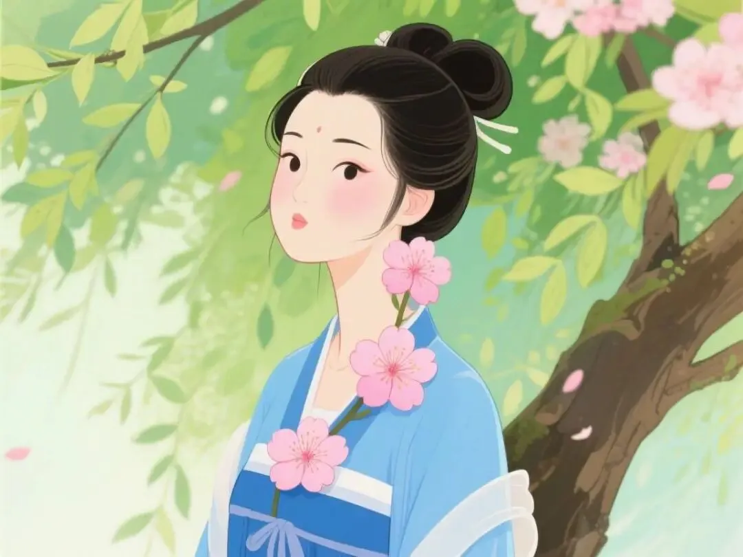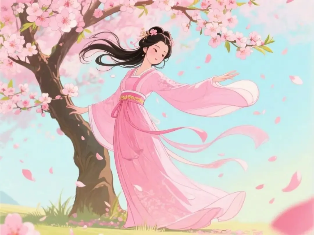 我输入了当天最有野心的一句话:”一个古风美女,站在桃花树下,风吹起她的头发和裙摆,阳光透过花瓣洒在她脸上”