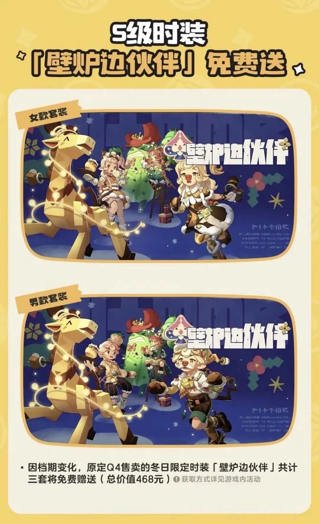 免费领3套S级时装:开服登录即送原定Q4售卖的冬日限定时装「壁炉边伙伴」(含男女款共3套),总价值468元,直接白给。