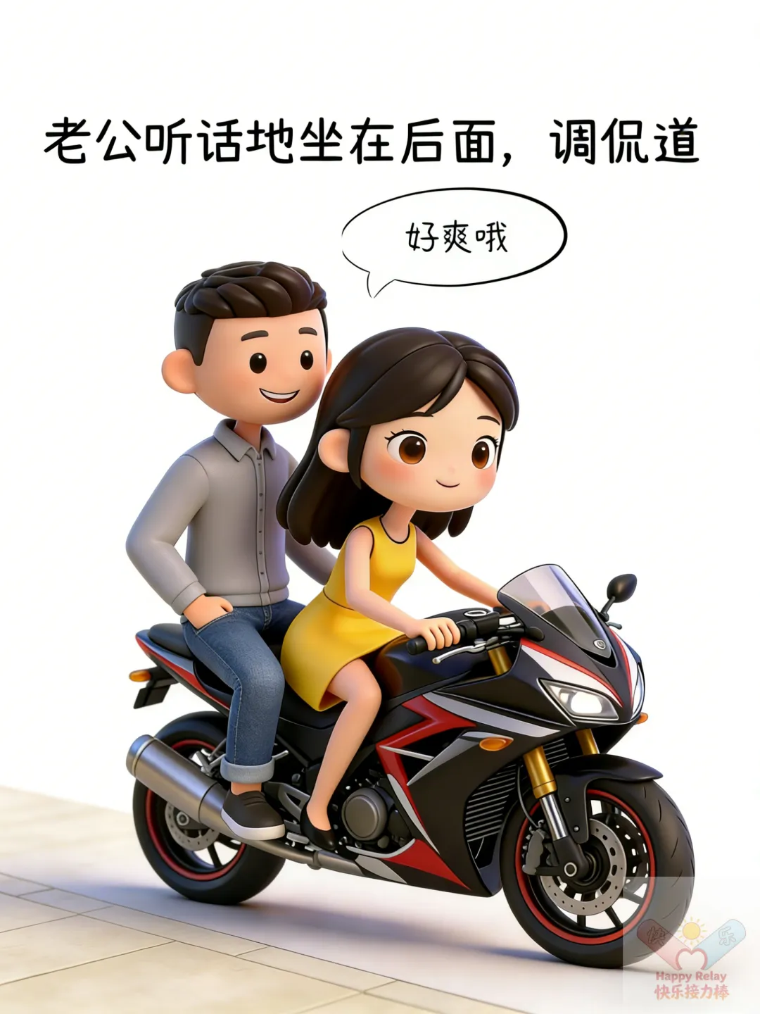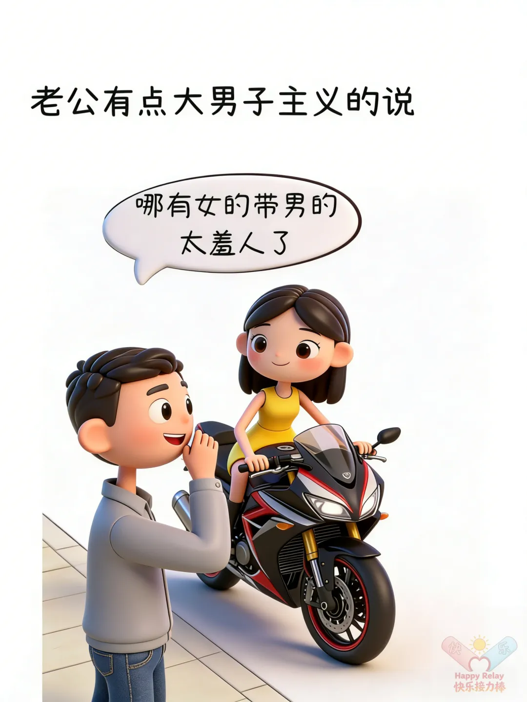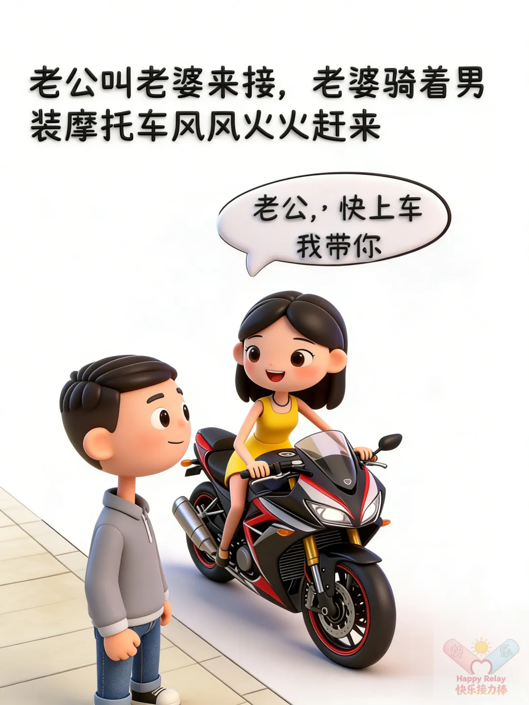 搞笑漫画:老婆骑着男装摩托车风火赶来接老公!老婆:快上来!我带你!老公:哪有女的带男的!太羞人了!老婆:我就喜欢你坐在后面的样子