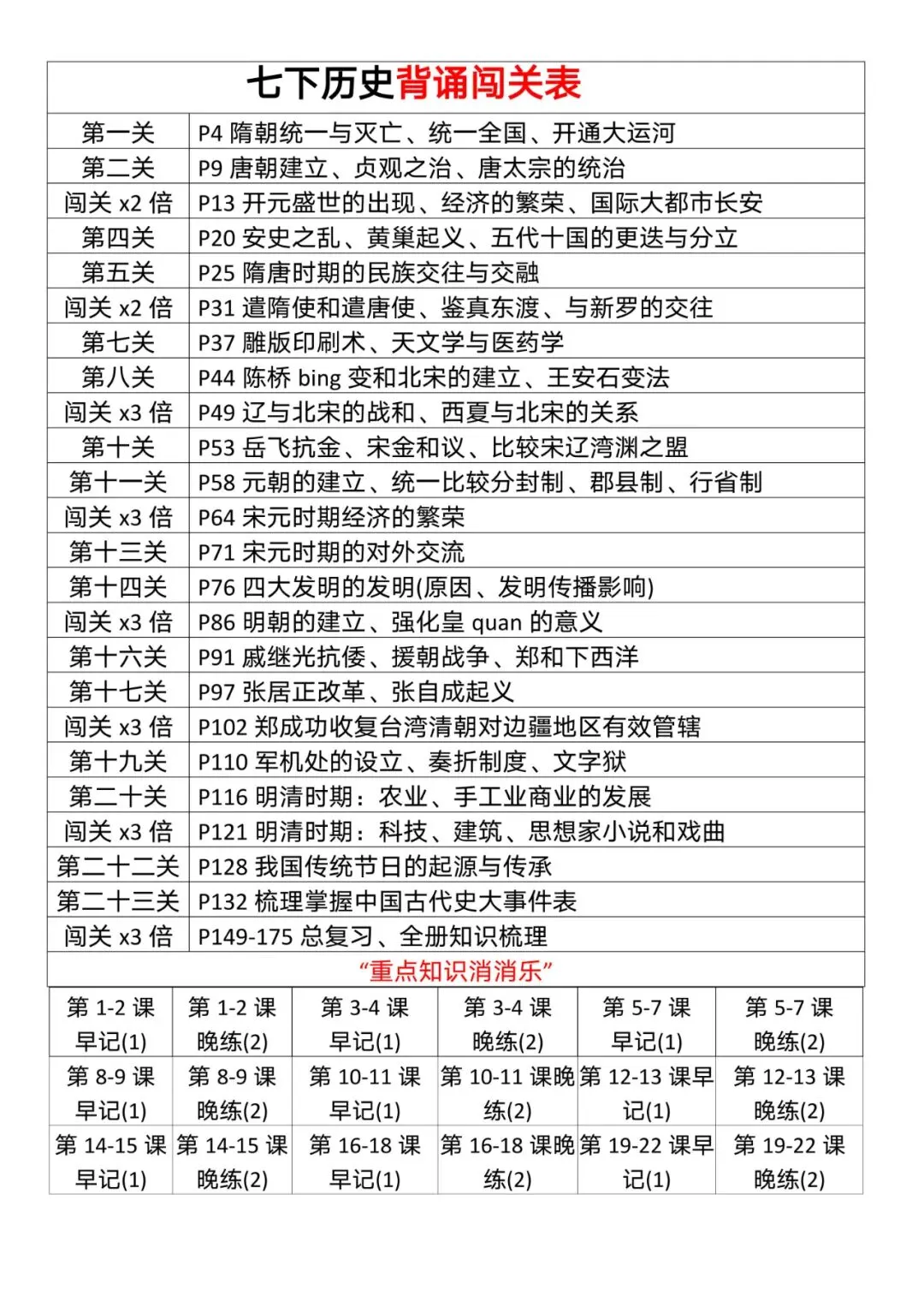 七年级下册历史背诵闯关表清单全册电子版可打印
