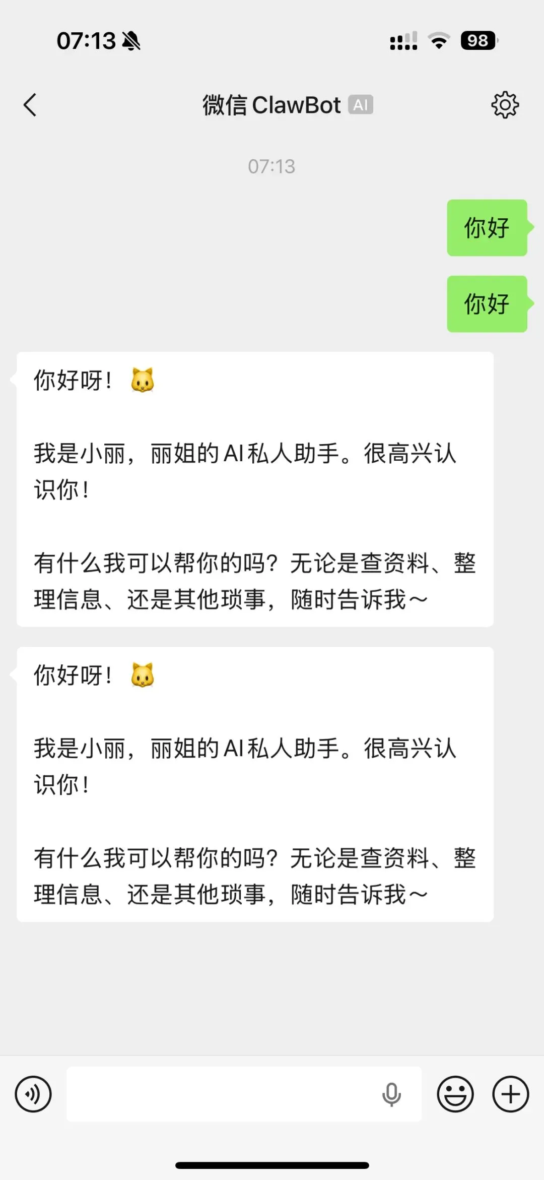 连上之后,微信里会出现一个「微信 ClawBot」的对话窗口。
