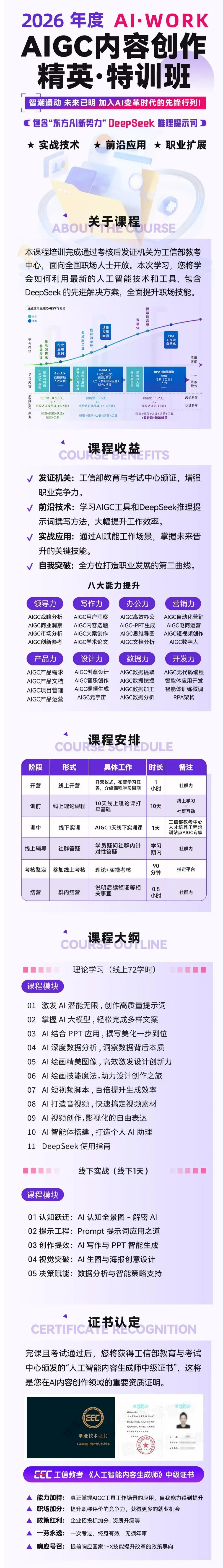 别再盲目自学了。由工业和信息化部教育与考试中心颁发的《人工智能内容生成师(中级)》认证培训正在火热报名中!专为想系统提升、持证上岗的你量身打造。系统课程 + 权威认证 + 实战训练,让你从 “会用 AI”,升级为 “专业 AI 内容生成师”。