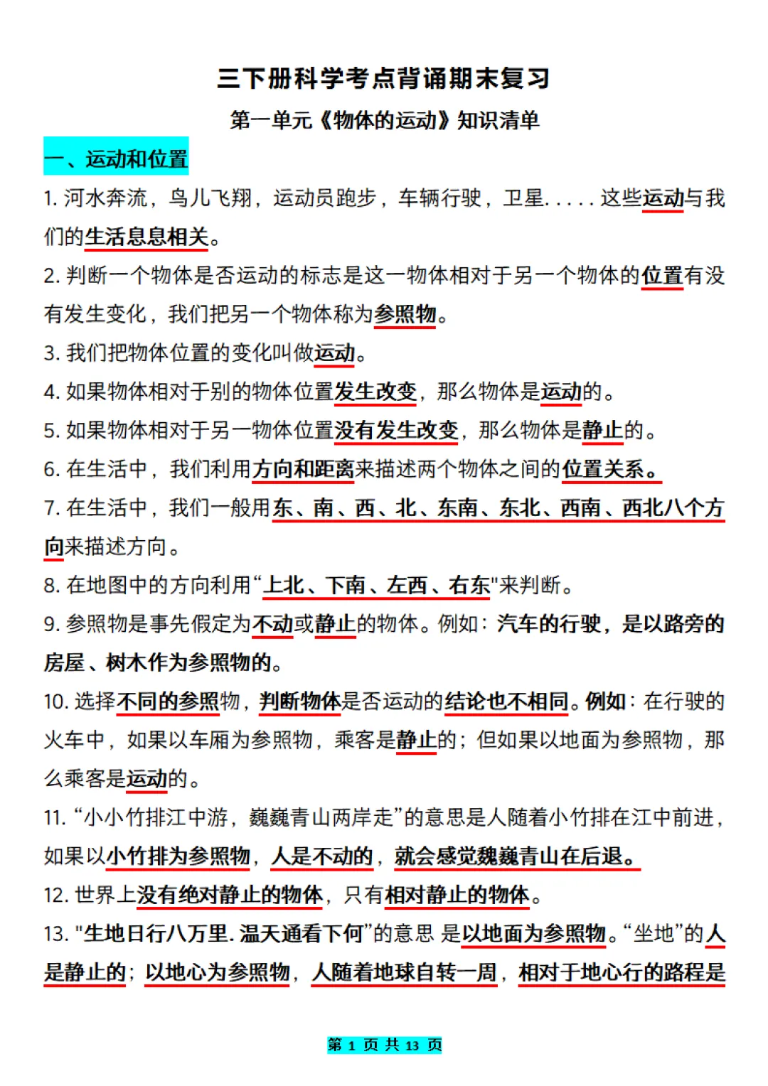 今天为大家分享:三年级下册科学第一单元《物体的运动》是探究物质世界的核心篇章,考点背诵清单系统梳理了运动与位置、运动形式、直线 / 曲线运动、速度比较、过山车制作等核心知识点,为期末复习提供了清晰的知识框架。