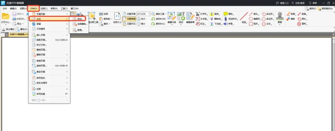 一款专业的PDF文档编辑工具,界面简洁,操作易懂,且涵盖丰富功能。打开后直接导入目标文件,支持多文件并行处理,接着依次点击文档—水印—添加。