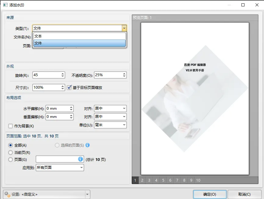 在自动弹出的“添加水印”窗口可对来源、外观、布局选项及页面范围进行调整,水印类型可选文本或文件,如果想添加图片水印,应将水印类型选为“文件”。