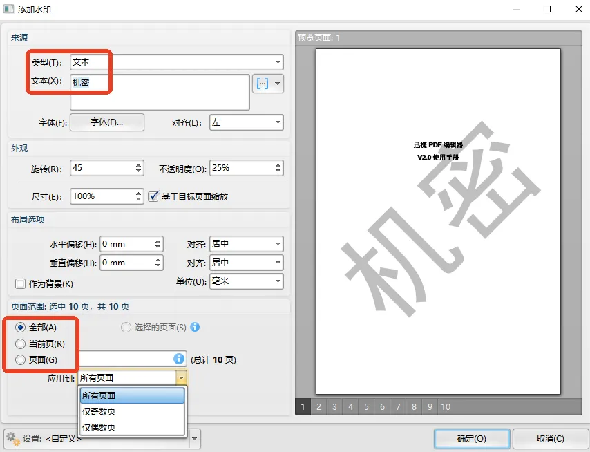 文本水印的内容可自主填写,字体、位置、尺寸、旋转角度、不透明度等参数也能按需设置,页面范围除默认的全部外还提供当前页、仅偶数页等多个选项。