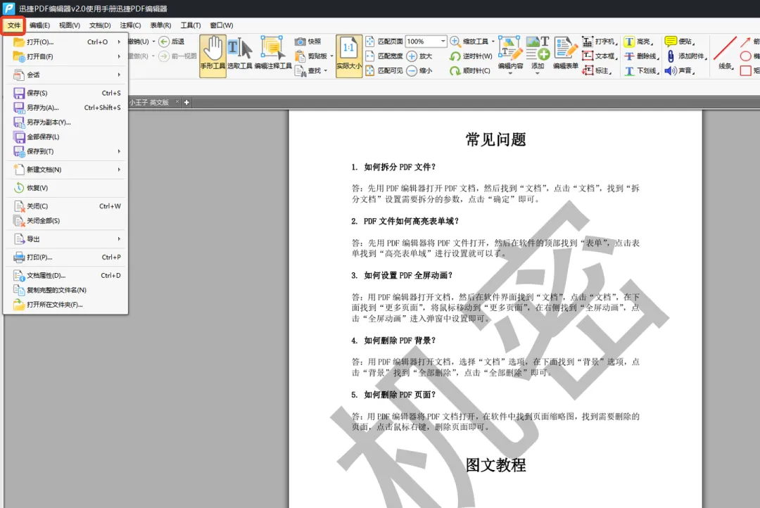 水印添加好后能直接预览并支持逐页查看,效果满意后按下“确定”便会自动返回到主界面了,再点击左上角的“文件”执行保存、打印、会话、恢复等操作。