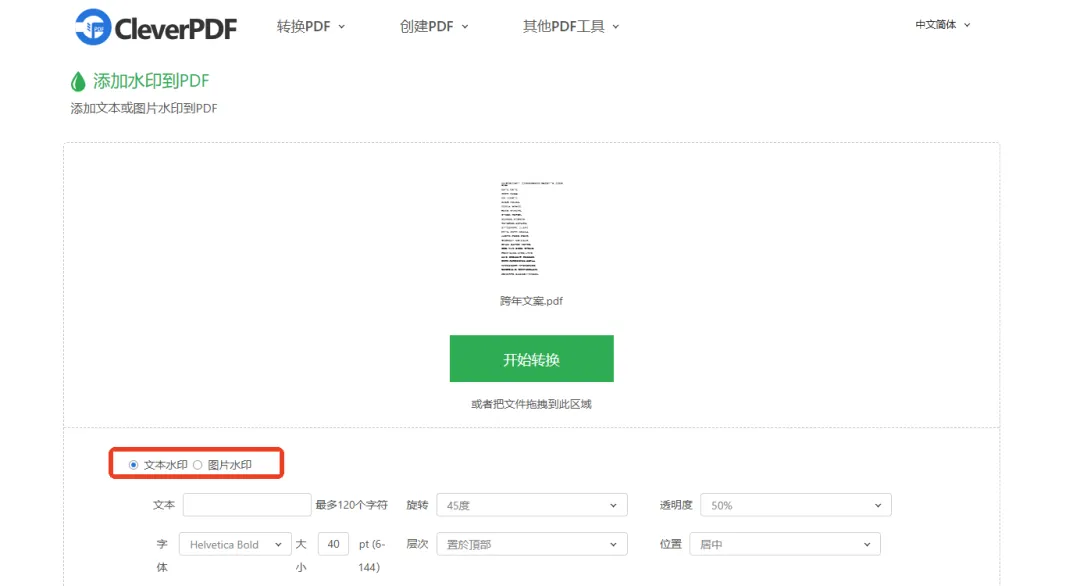 这里用到的是【添加水印到PDF】,选中后上传单个文件,文本和图片水印都支持,再按需调整位置、透明度、旋转角度等参数,最后点击“开始转换”等完成。