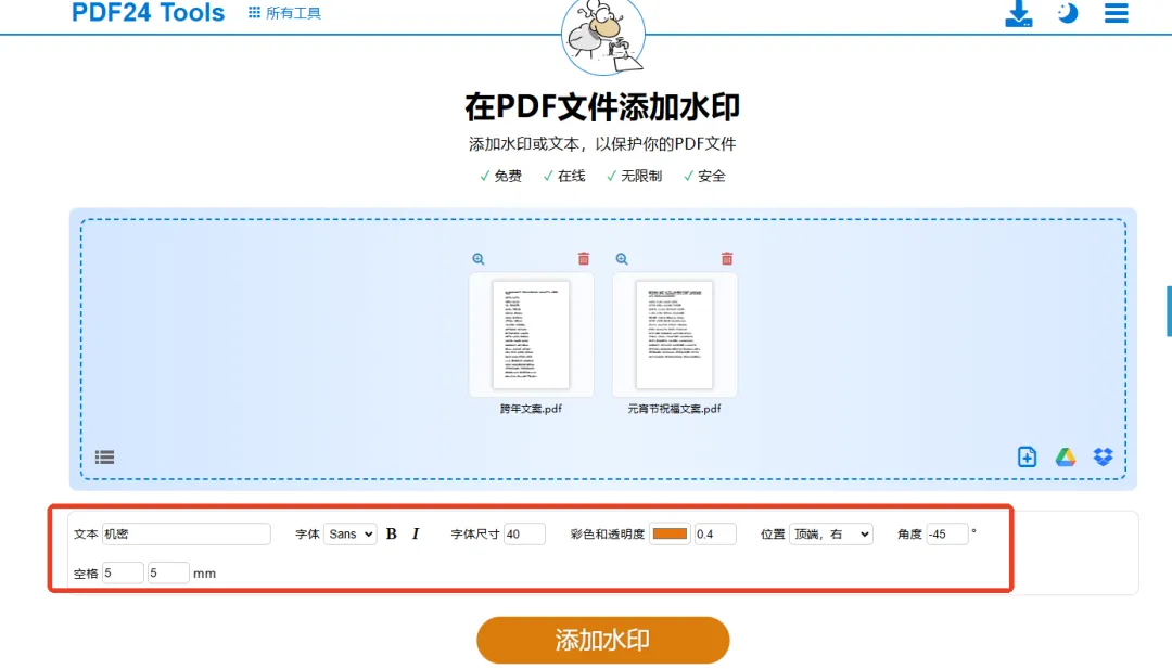 打开后选中首页上的“在PDF文件添加水印”,接着添加目标文件,单或多个均可,输入水印文本后再对字体、字号、位置等进行设置,最后按下“添加水印”。