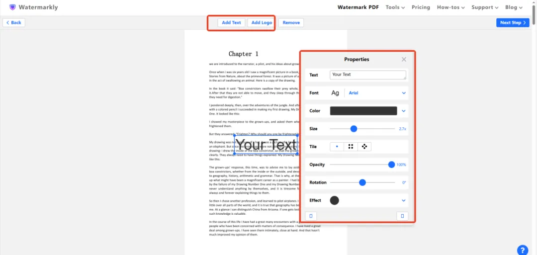 先找到“Tools”下拉列表里的【Watermark PDF】,再点击“Select PDF”导入单或多个文件并按下“Next Step”,添加水印后自定义相关参数,最后下载。