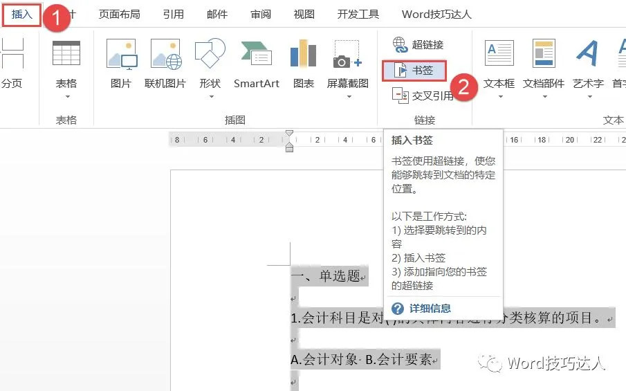 选中文档的题目部分,单击【插入】选项卡-【链接】功能组的【书签】添加为书签名【第一部分题目】,接着将文档的题目答案添加为书签名【第一部分答案】。