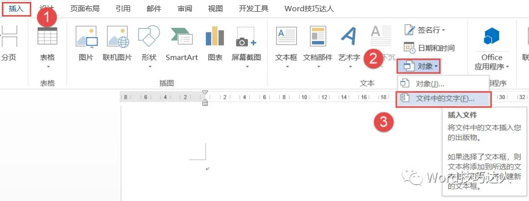 按【Ctrl+N】新建文档,将所有的文档全部合并到新文档中。单击【插入】选项卡-选择【文本】功能组-【对象】中的【文件中的文字】。