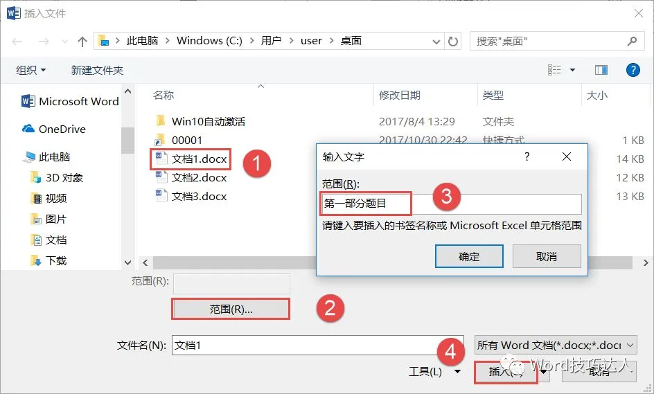 在弹出的【插入】对话框中选择你需要合并的word文档,选择文件后,单击【范围】,在弹出的【输入文字】对话框输入,刚刚定义的书签名【第一部分题目】,单击【插入】。