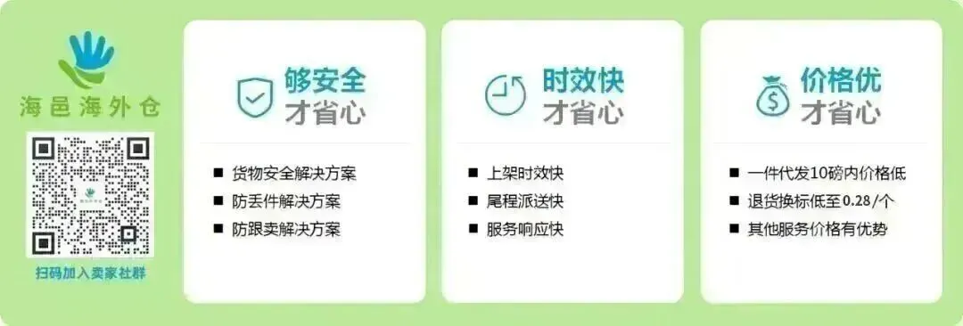 以上内容卖家们要认真看了,有需要备货渠道的卖家可以找海邑海外仓哦!海邑作为12年的海外仓知名品牌,在美国、英国、德国、法国、日本、波兰、加拿大7个国家拥有19家海外仓,10年来一直为客户提供专业的一件代发、仓储中转、贴换标服务,服务全面、时效快捷,安全又可靠。有需要的卖家长按下方二维码添加微信可直接咨询!