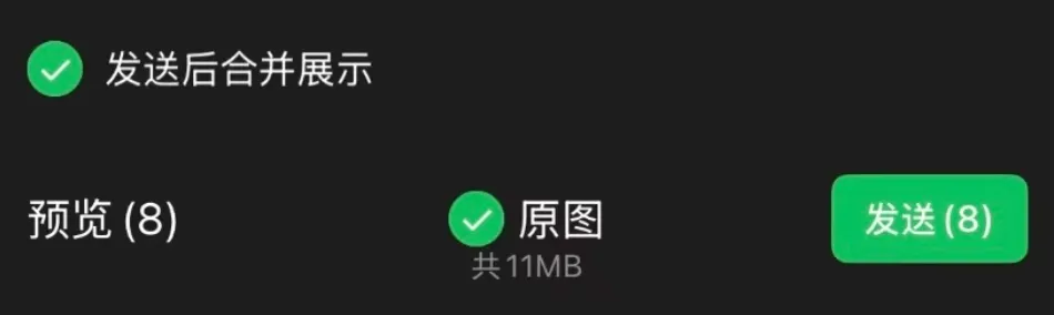 更新后发送图片选择三张及以上后,现在界面左下角将会出现“发送后合并展示”的选项,勾选后发送的图片将会以“折叠”的样式展示,用户可以左右滑动预览图片,也可以点击图片旁边的展开查看。