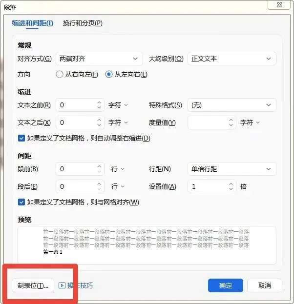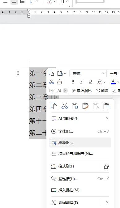 2.全选内容,鼠标右键,在弹出窗口选择段落,在段落对话框点击制表位。