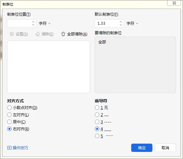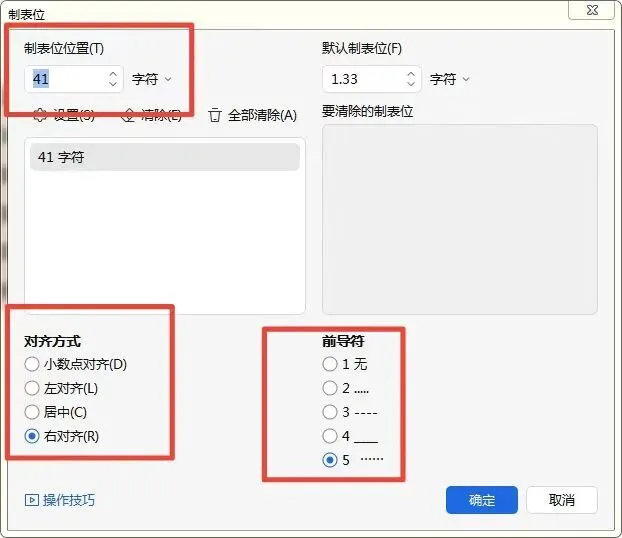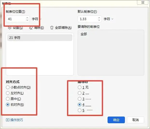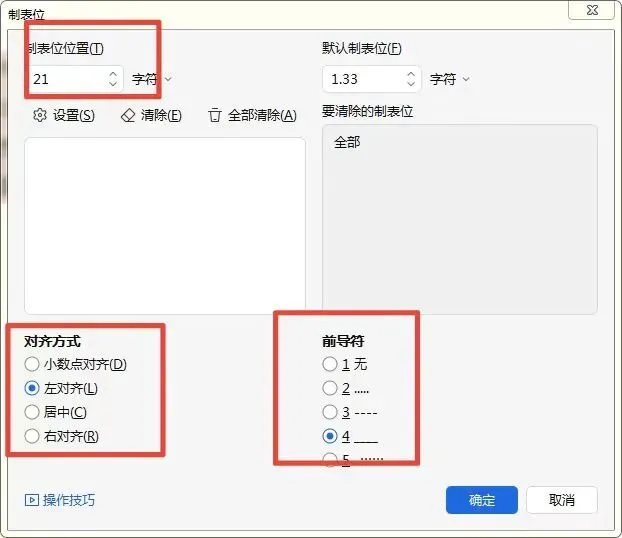 4.再次设置设置制表位位置、对齐方式、前导符,制表位位置按照实际设置数值。点击确定按钮。