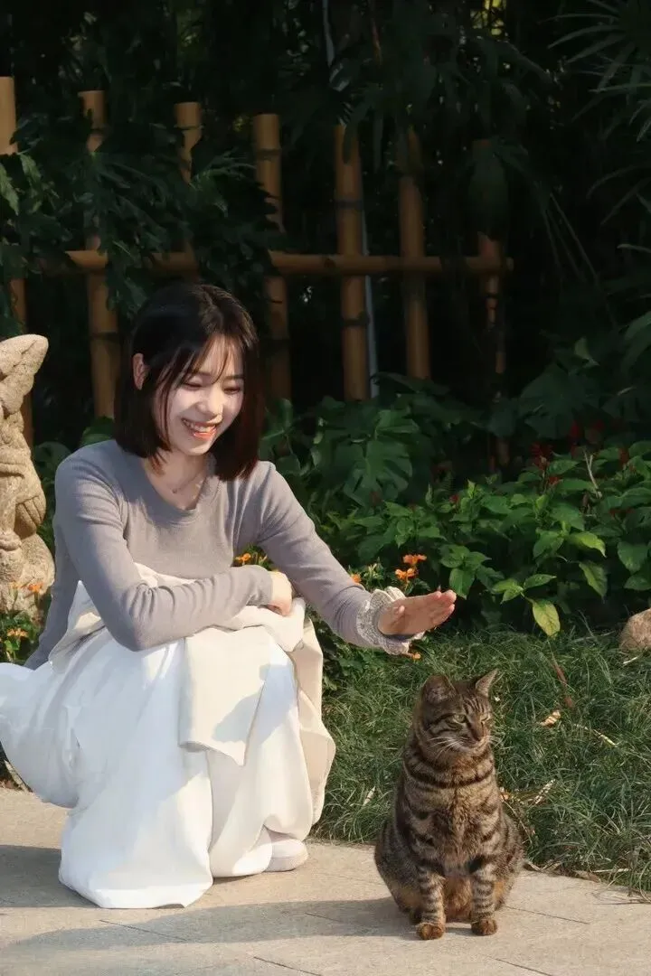 蹲着逗猫的画面更感人。针织衫配长裙,侧逆光一抹,整个人就处在金色的氛围当中。低头一笑的时候,手腕处无意中出现了一些蕾丝边,这样的细节很好地加强了柔美感。