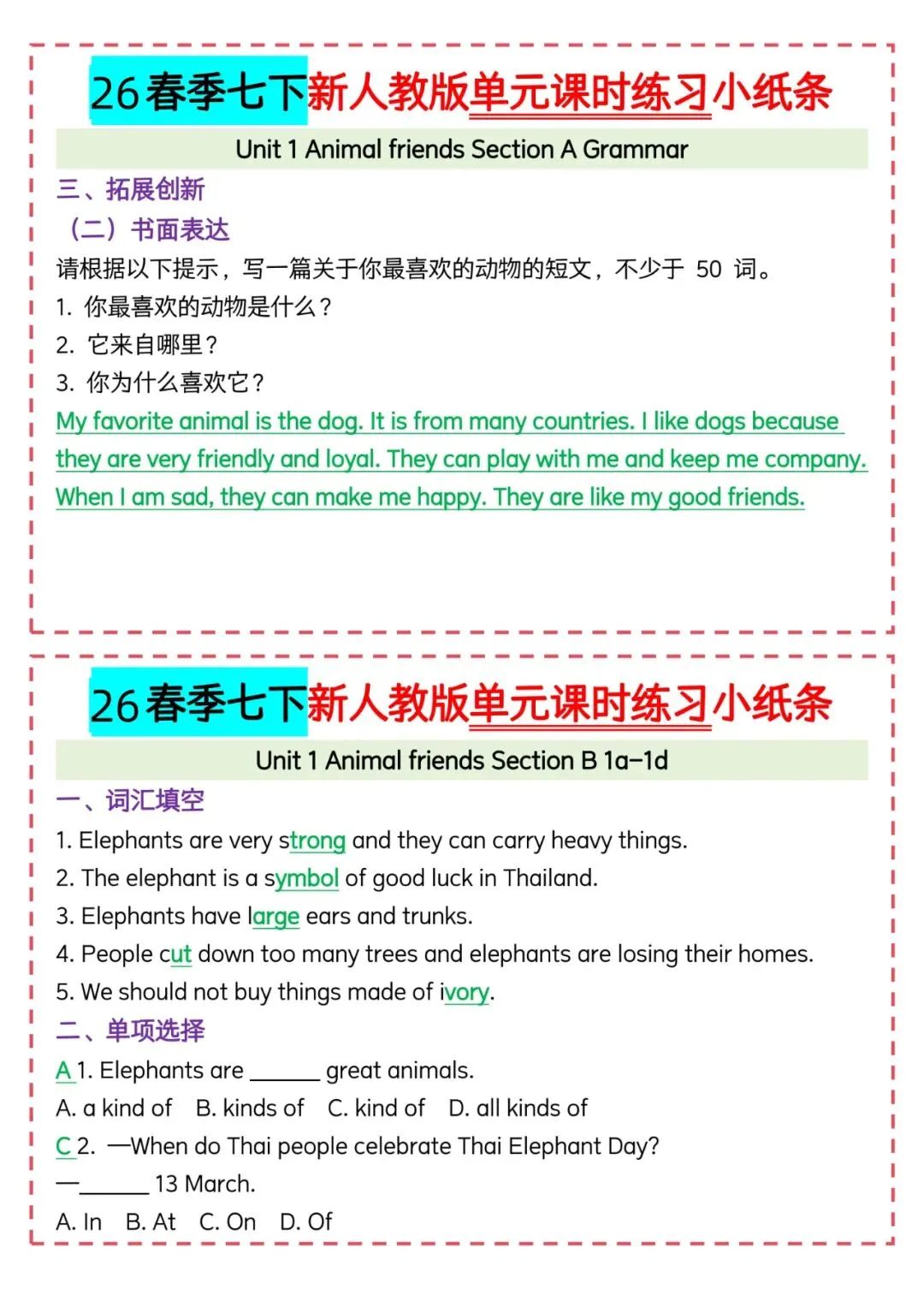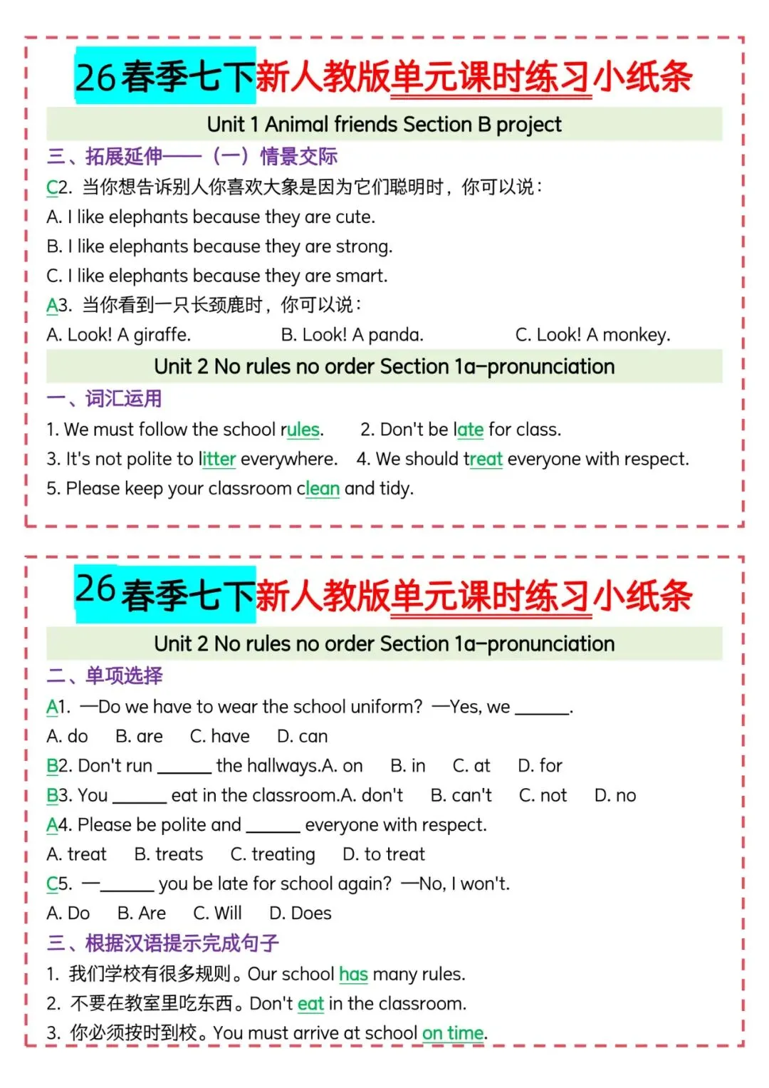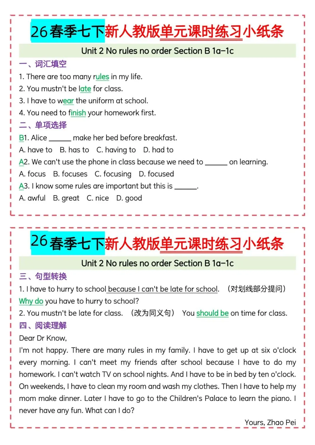今日老师为大家整理了:七年级下册英语新人教版单元课时练习小纸条电子版可打印