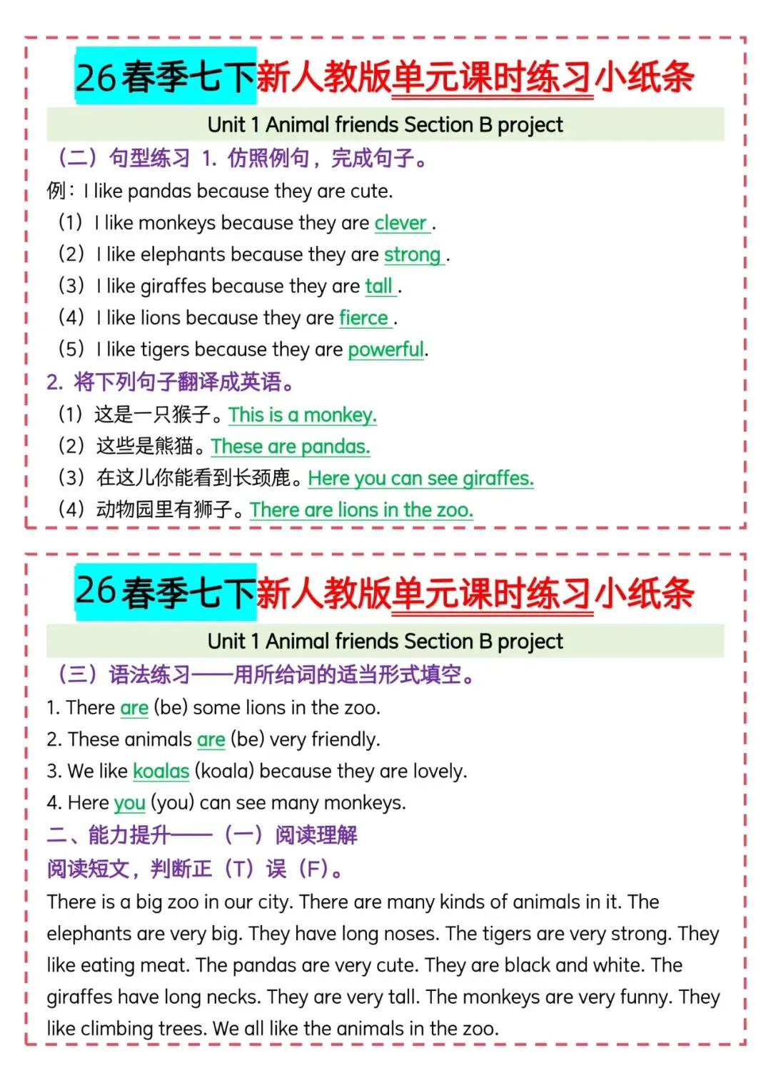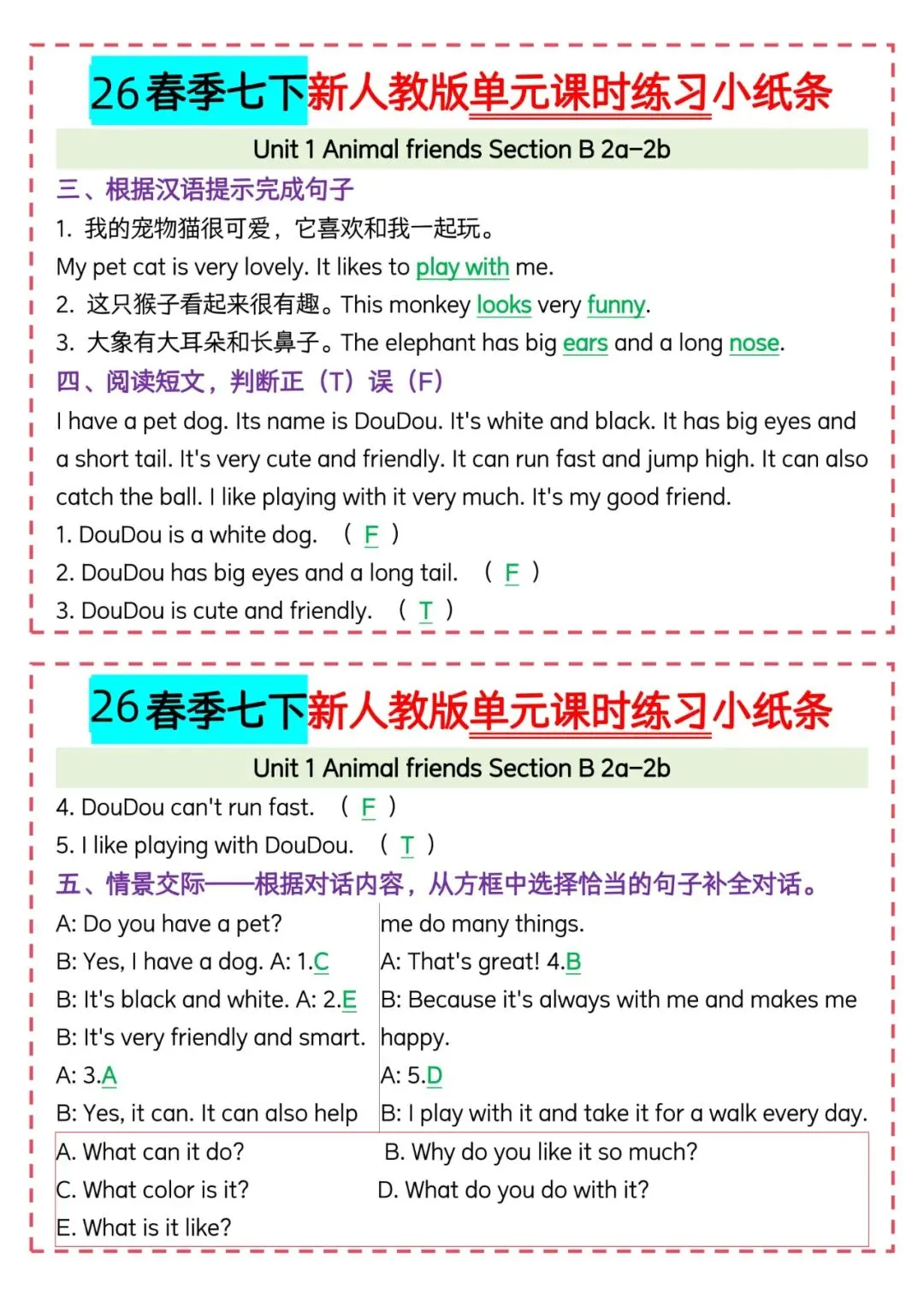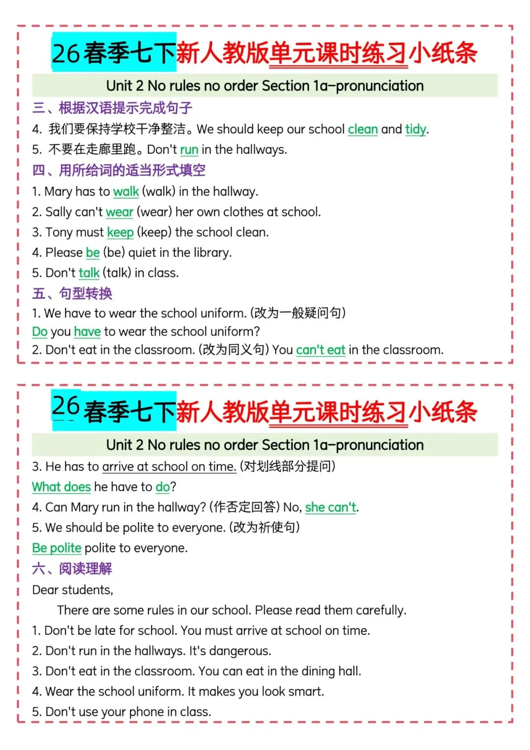 今日老师为大家整理了:七年级下册英语新人教版单元课时练习小纸条电子版可打印