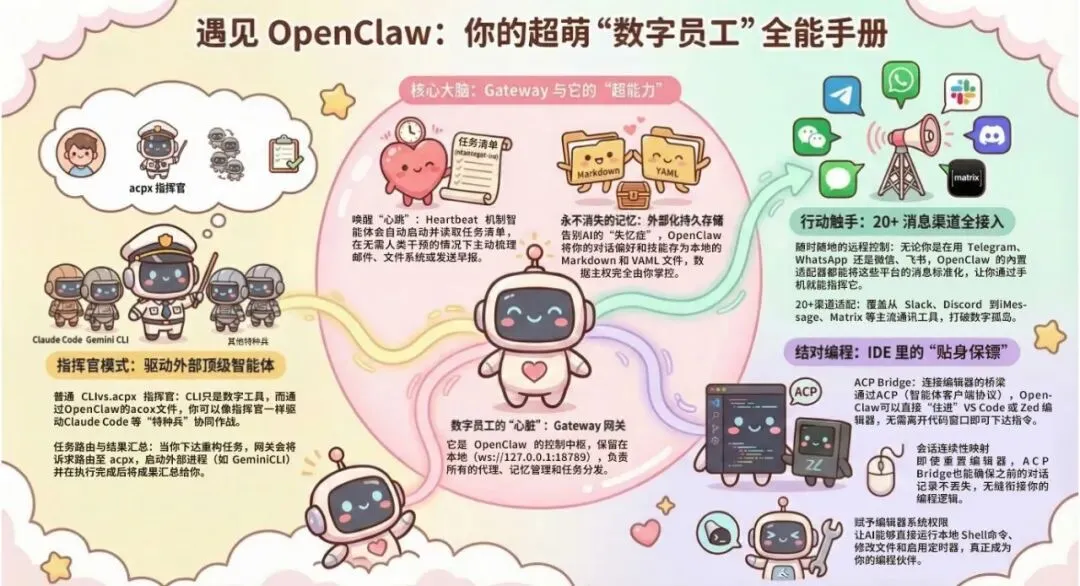 OpenClaw 被广泛描述为“真正能做事的 AI”(The AI that actually does things),其核心能力的构建不仅依赖于底层大模型的智慧,更源于其精妙的网关架构与任务执行机制 8。