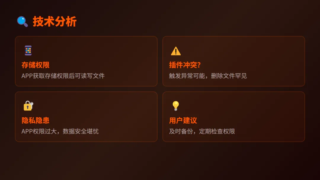 “插件冲突”能否导致文件被删除?理论上存在可能性,但概率极低。更值得关注的是:为什么APP需要如此大的权限?
