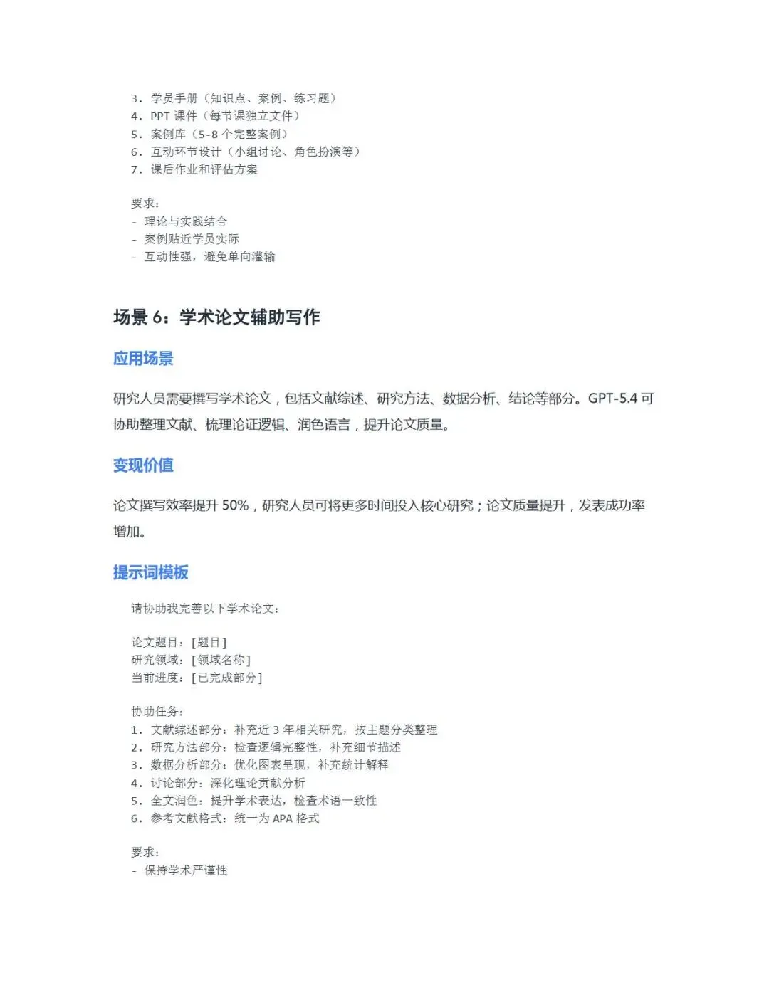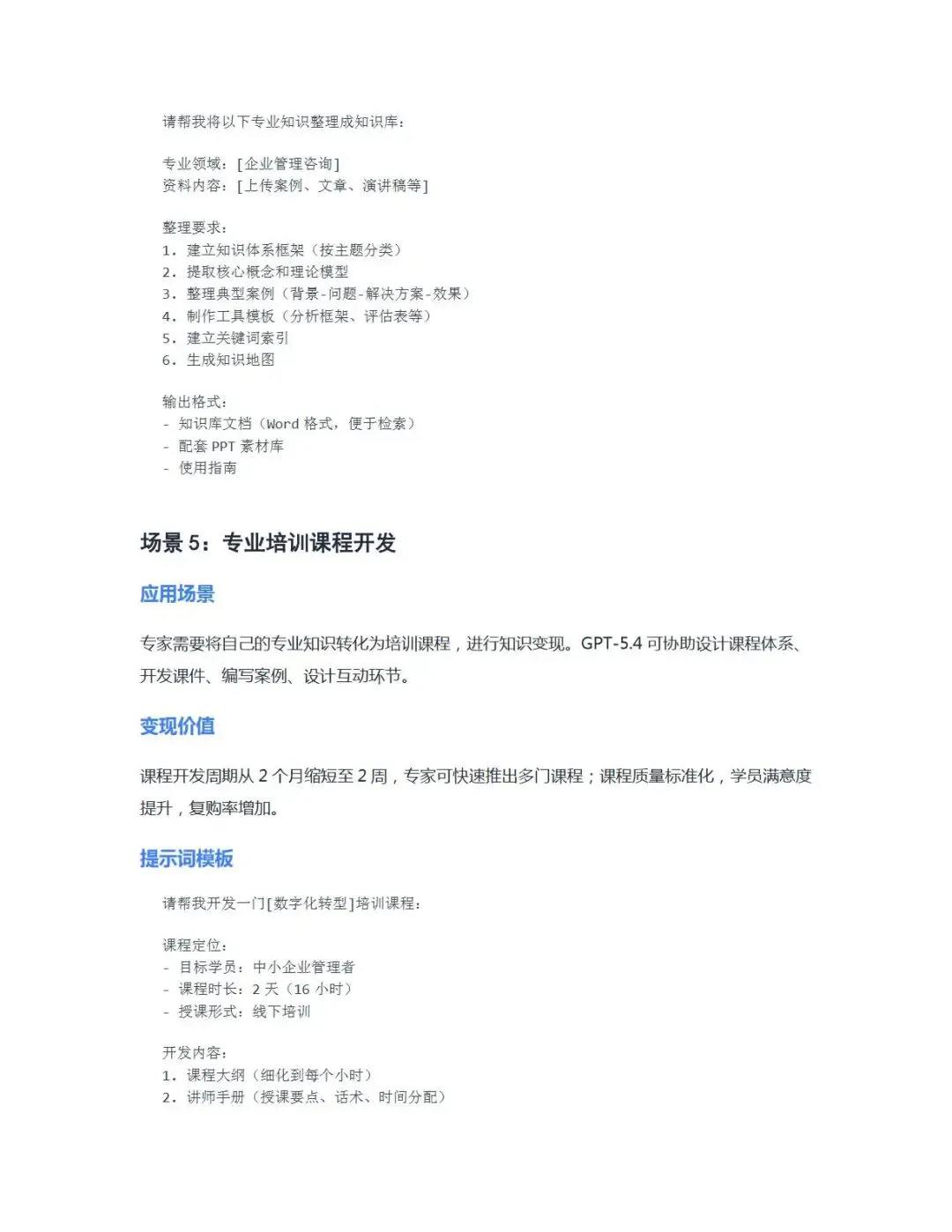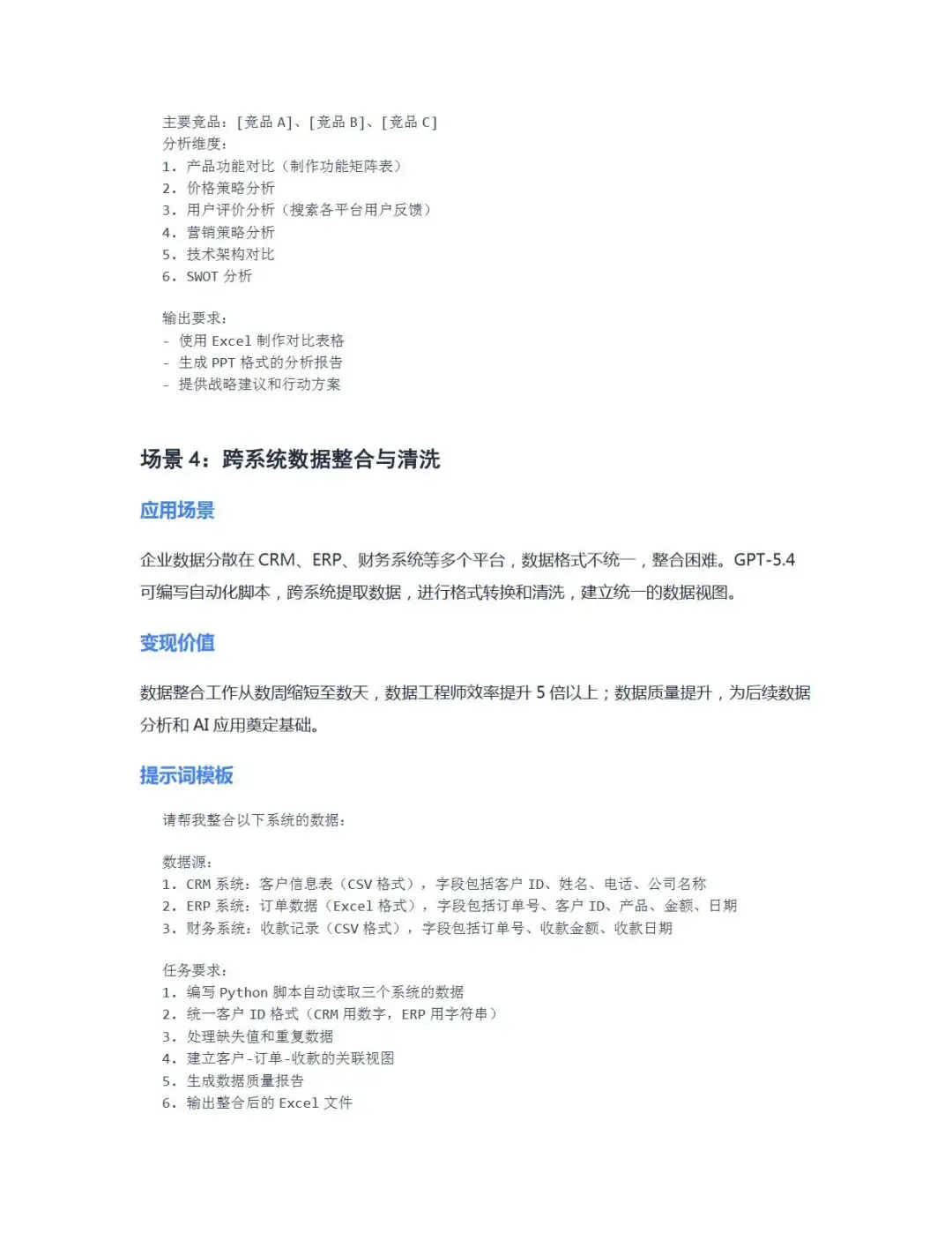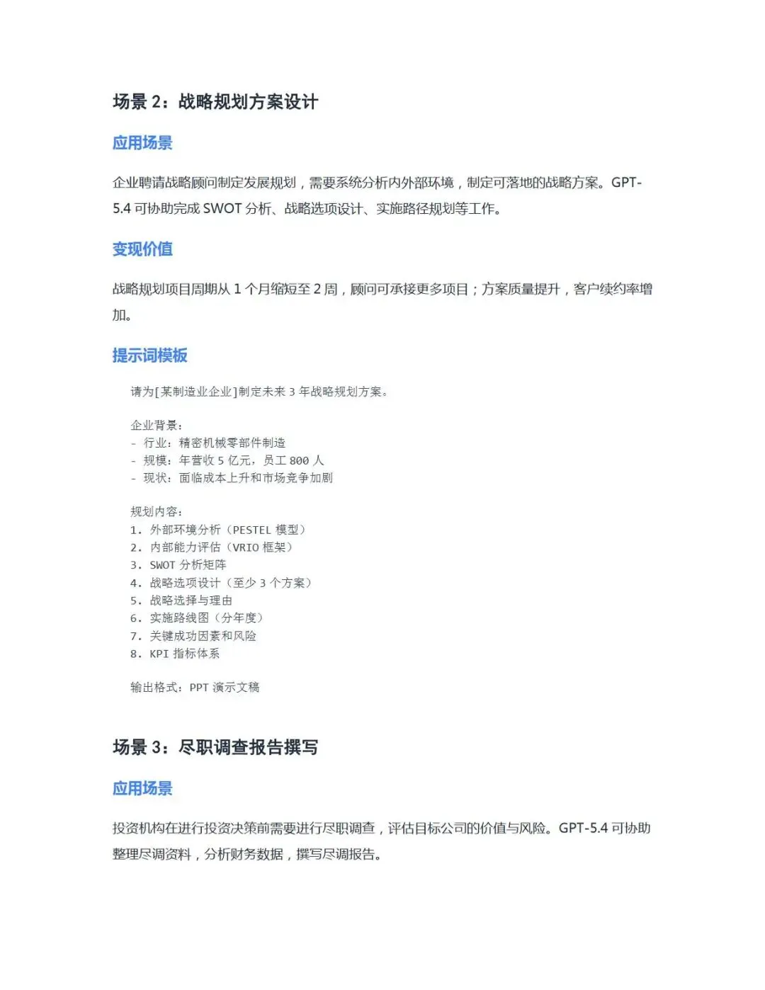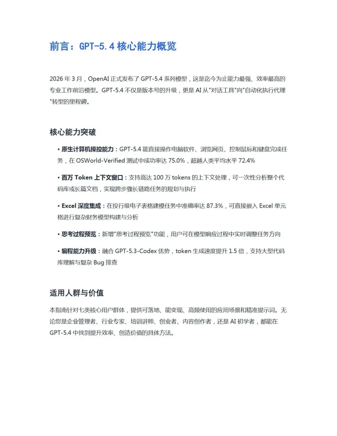 2026年3月OpenAI发布的GPT-5.4系列模型,是AI从对话工具向自动化执行代理转型的里程碑式产品,凭借原生计算机操控、百万Token上下文、Excel深度集成等核心能力突破,成为当前专业工作领域能力与效率兼具的前沿模型。本指南立足GPT-5.4的功能特性,针对企业、专家/顾问、讲师/培训师、老板/管理者、主播/自媒体、电商运营、小白/初学者七大核心用户群体,梳理了各场景下可落地的应用方向,配套精准提示词模板与实操方法,同时附提示词优化技巧,助力不同用户群体充分发挥模型能力,实现工作效率提升与价值创造,为各行业高效运用GPT-5.4提供了全面、系统的实战参考。