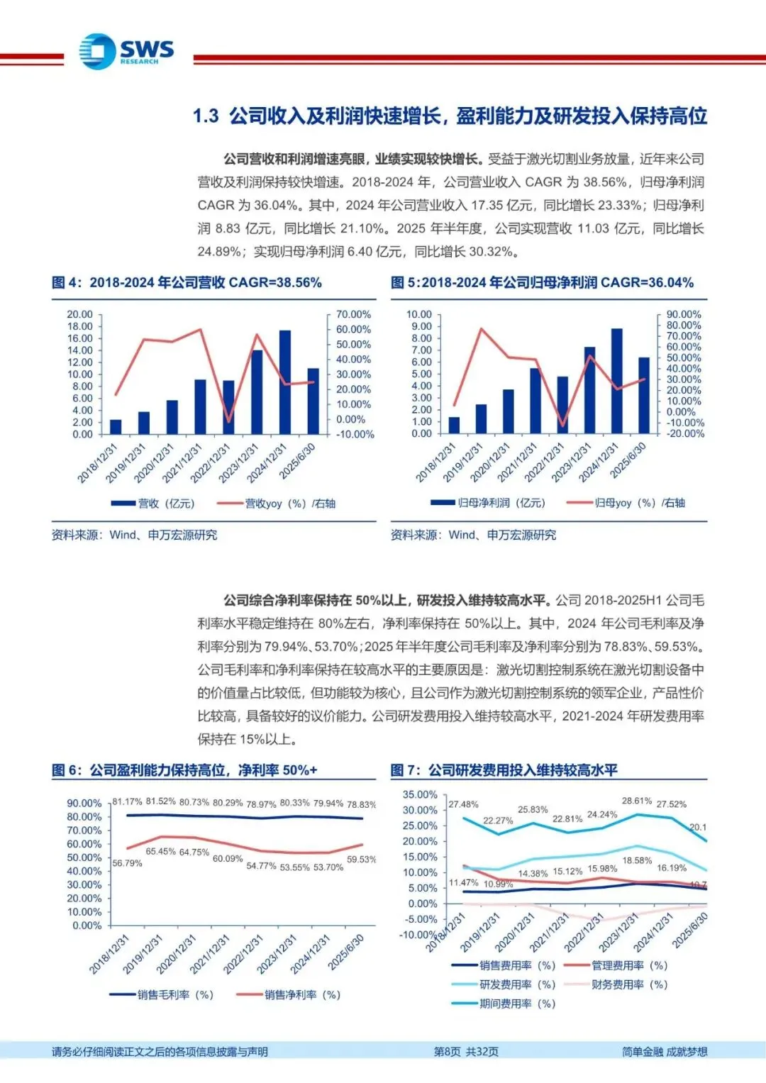 占有率稳居第一,穷实基本盘业务增长;智能焊接及精密精加工稳步发展,构筑公司第二二成长曲线。2018-2024年,公司营业收入CAGR为38.56%,归母净利润CAGR为36.04%%。公司2018-2025H1公司毛利率水平稳定维持在80%左右,净利率保持在50%以上。