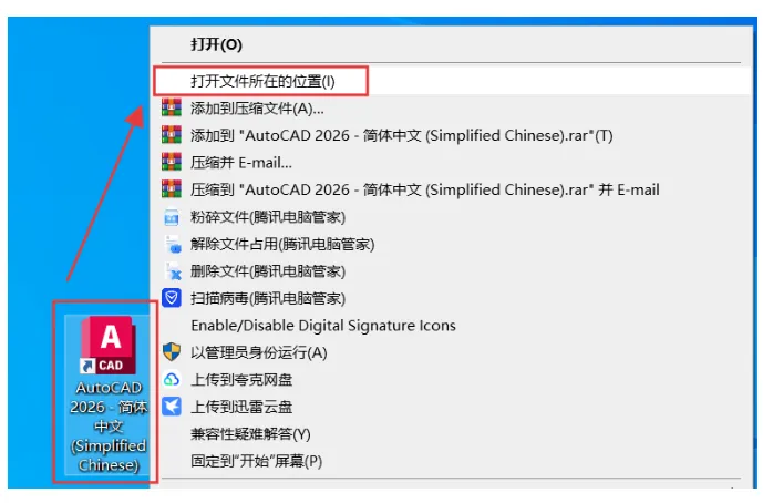 12.返回电脑桌面找到【CAD2026图标】,鼠标右键【打开文件所在位置】。