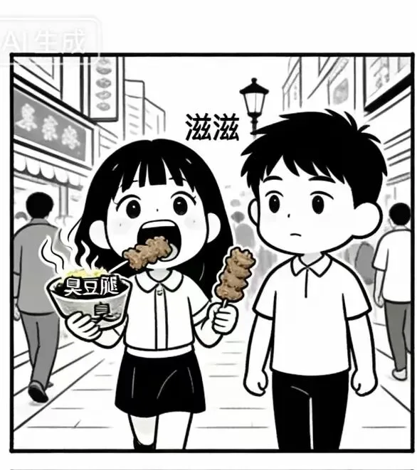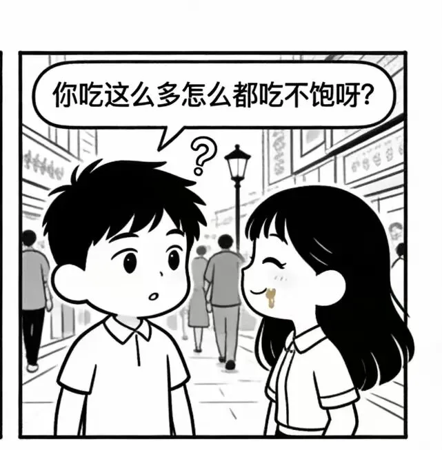 搞笑漫画:逛街时女友吃个不停,我说:“你吃这么多怎么都吃不饱呀?”女友:“我现在身上是两个人要吃当然吃不饱了!