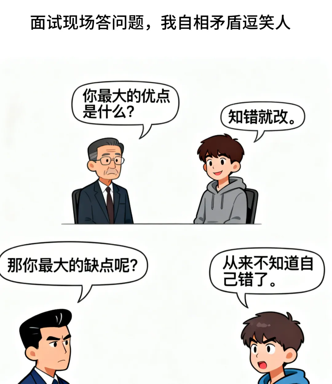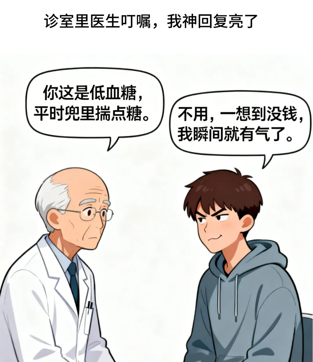 趣味漫画:医生说:你低血糖,平时兜里揣点糖.我:不用,一想到没钱瞬间就有气了.面试官:你最大缺点?我:从来不知道自己错了.