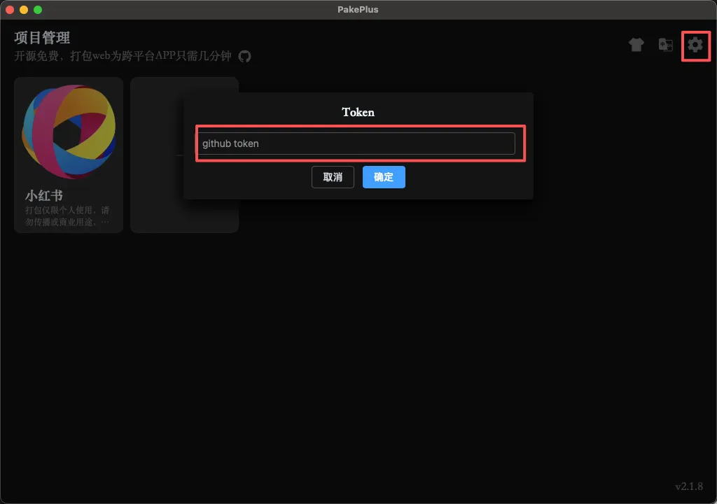 打开软件,点击下面的+创建项目,如果是打包的多平台的软件,需要到Github上面获取Token,需要登录,获取Token教程详见链接:https://pakeplus.com/zh/guide/token.html,获取到Token后,把Token复制粘贴到下图的文本框中,点击确定即可。