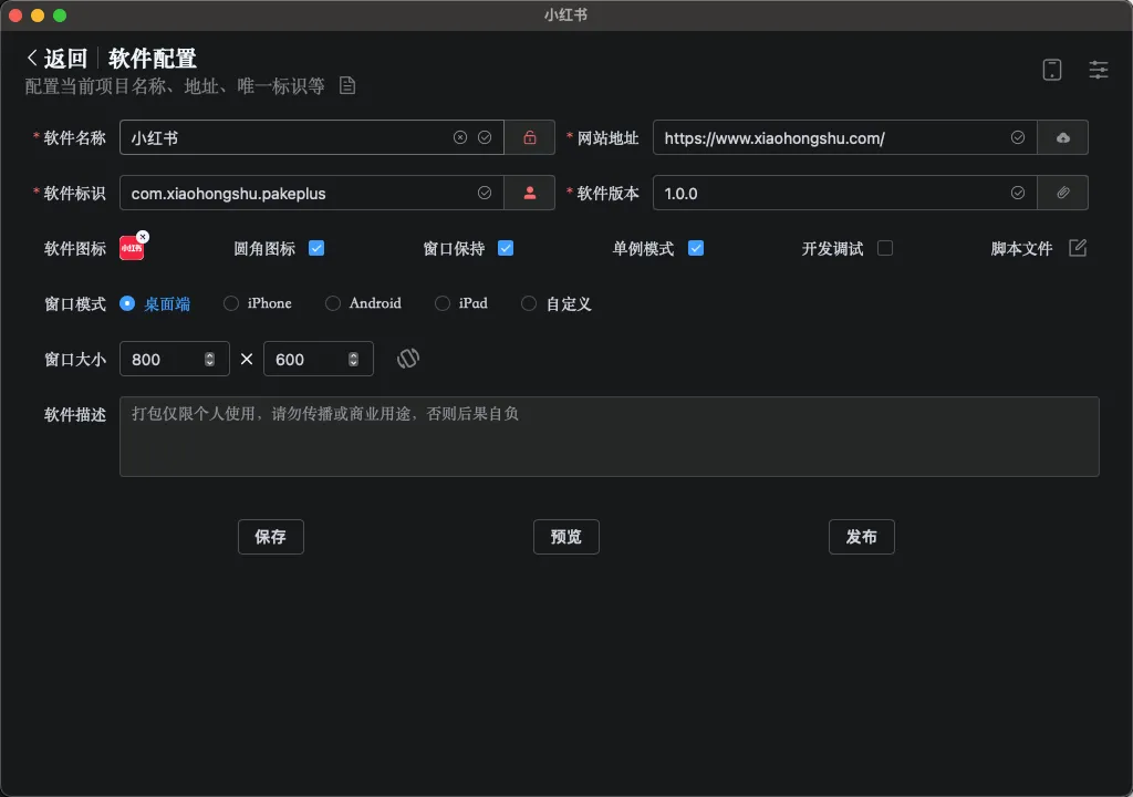 1. 软件名称:可以自定义打包的软件名称,我这里以小红书网站为例